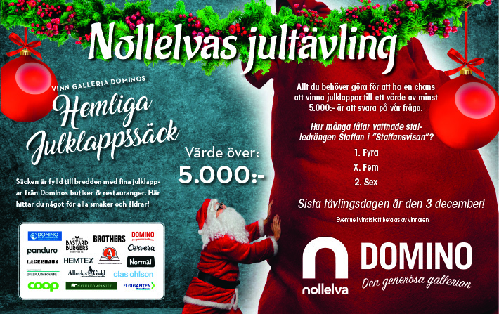 Tävla om en julklappssäck från "Domino" (värde över 5.000:-, ev. vinstskatt betalas av vinnaren). Svara på frågan för att delta i tävlingen. Maila in svaret till benny@nolltretton.se senast den 5/12-2025. Märk ämnesraden med "Domino Julklappssäck"
