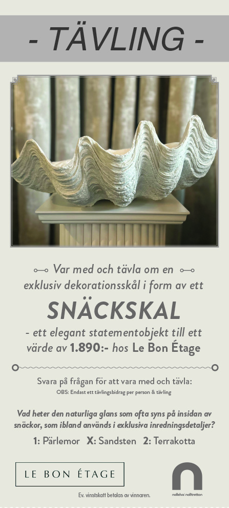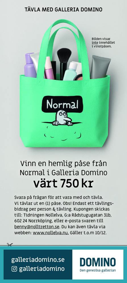 Tävla om en hemlig påse värd 750:- från "Normal" i Galleria Domino. (ev. vinstskatt betalas av vinnaren). Svara på frågan för att delta i tävlingen. Maila in svaret till benny@nolltretton.se senast den 5/12-2025. Märk ämnesraden med "Normal Domino". Tävla om en dekorationsskål från "Le Bon Étage" (värde 1.890:-). (ev. vinstskatt betalas av vinnaren). Svara på frågan för att delta i tävlingen. Maila in svaret till benny@nolltretton.se senast den 5/12-2025. Märk ämnesraden med "Le Bon Étage".